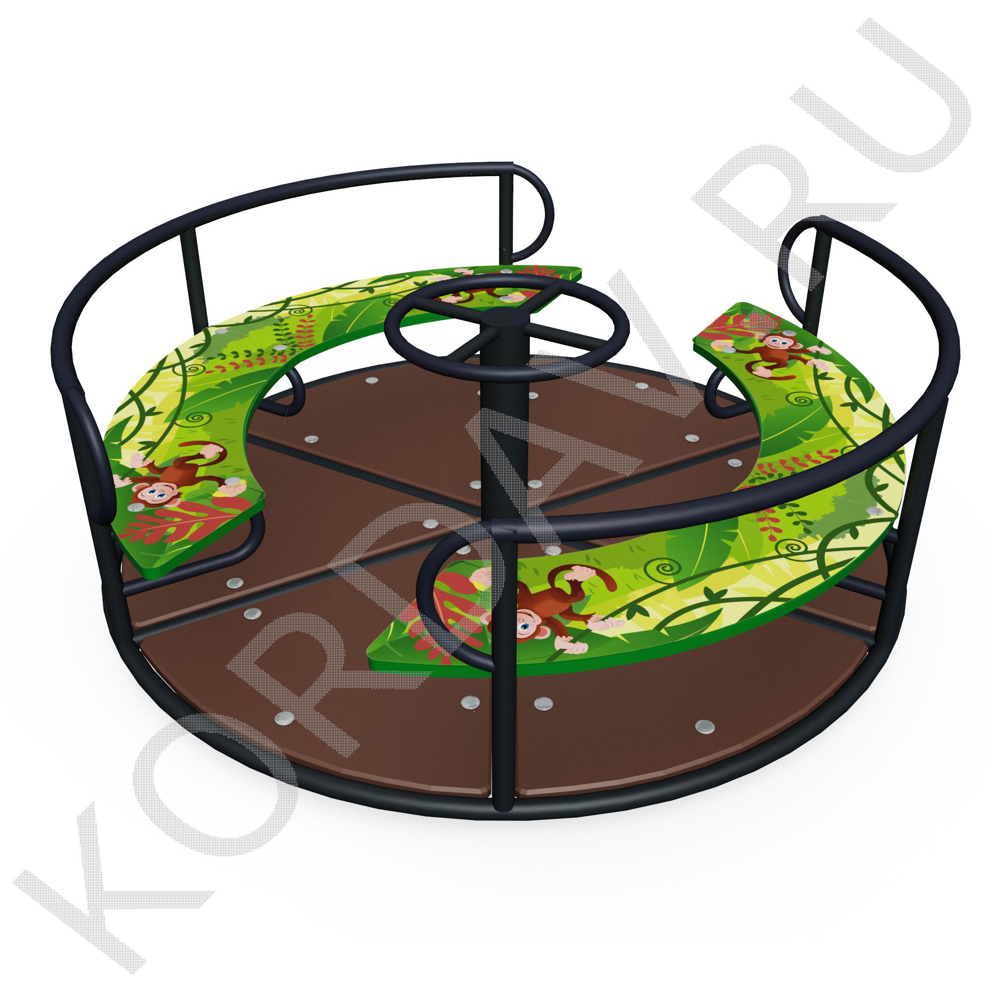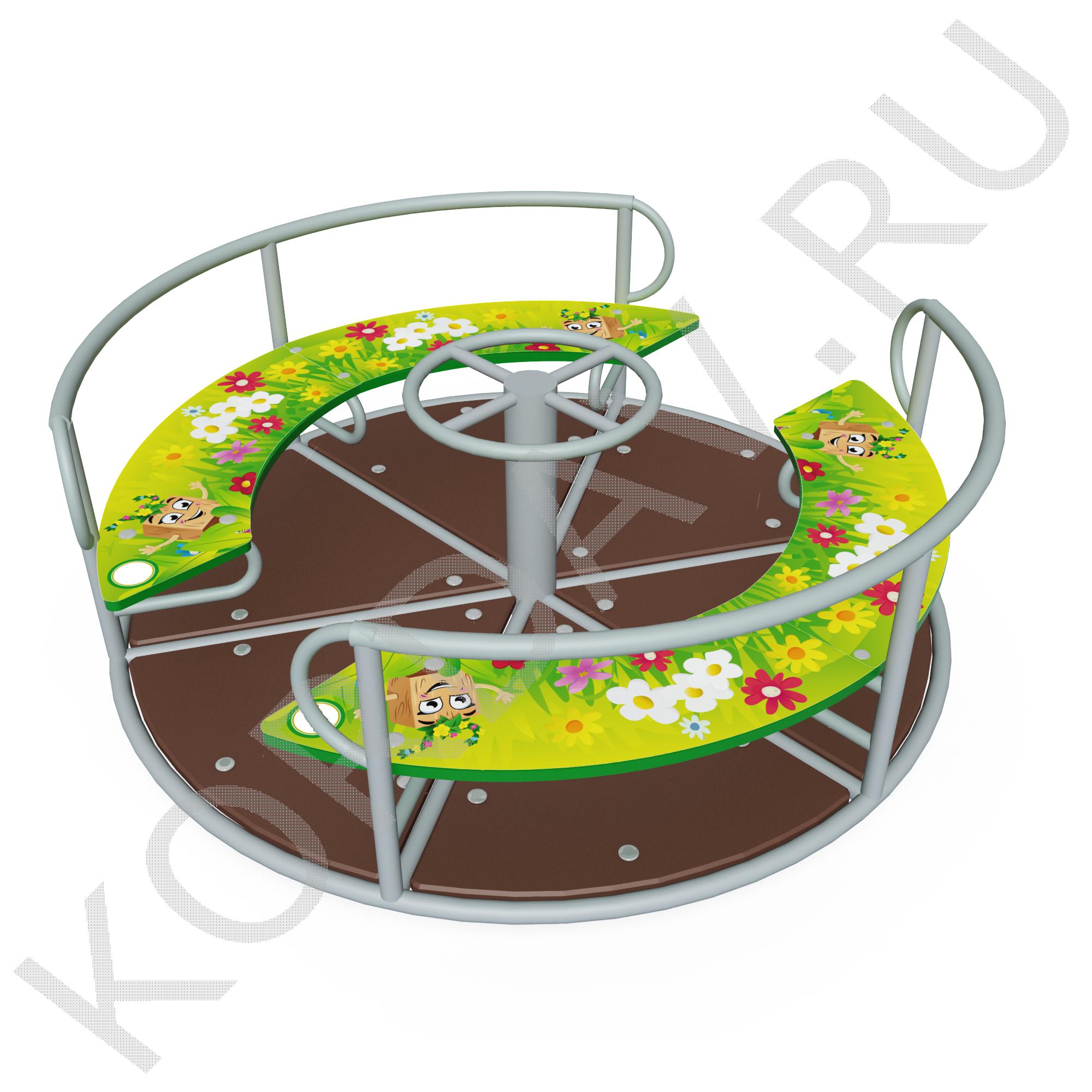 Эта карусель предназначена для детей от 3-х лет. Это металлическая конструкция с фанерным дном и деревянными сидениями. Сидения имеют металлические спинки и поручни. Пол покрыт влагостойкой фанерой толщиной 24 мм. Во избежание травматизма, фанера обладает анти скользящими свойствами. Металлический каркас конструкции установлен на валу с подшипниками и окрашен порошковыми красками. Карусель – это прекрасное устройство для активных детских групповых игр. Полностью безопасное и экологичное, соответствующее требованиям ГОСТ.