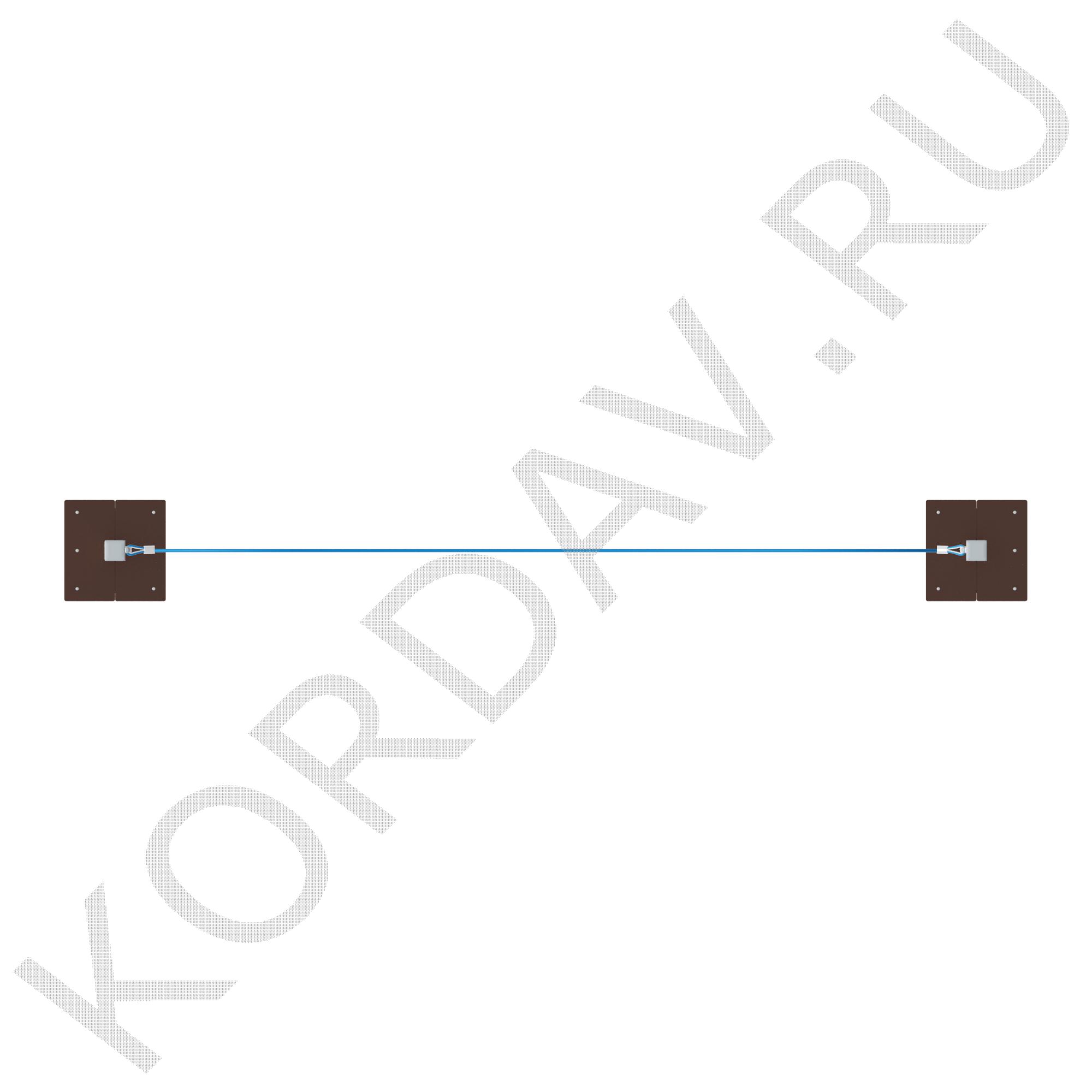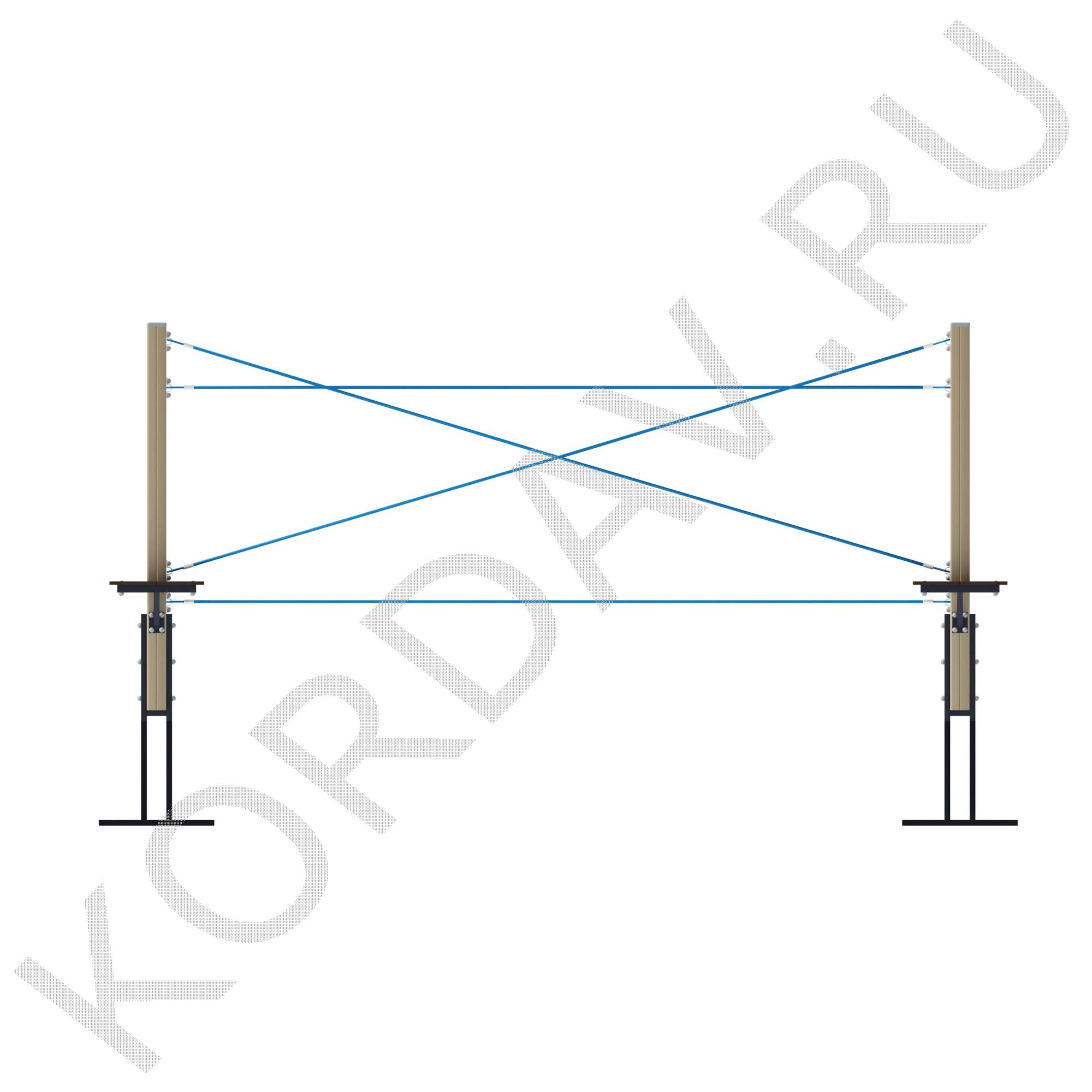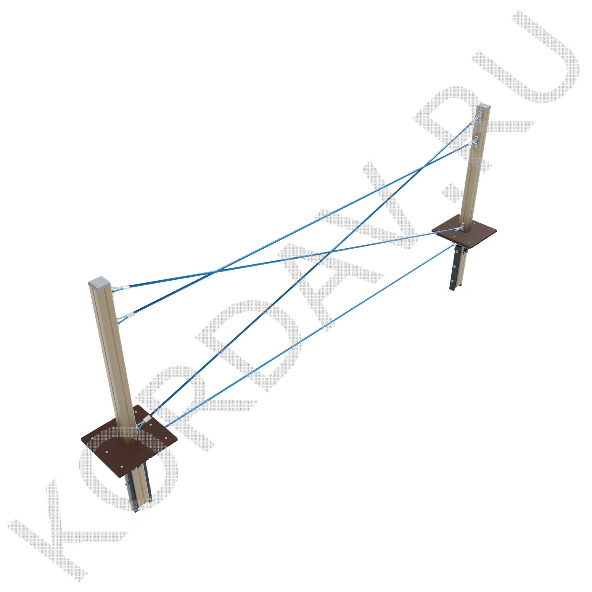 - Лаз канатный — выполнен из шестипрядного армированного полиамидного каната (тросовая свивка, диаметр 16 мм). В комплекте 4 каната различной длины. Крепление к столбам — коуши и скобы. Размер: 4050×1424 мм. Количество: 1 комп.